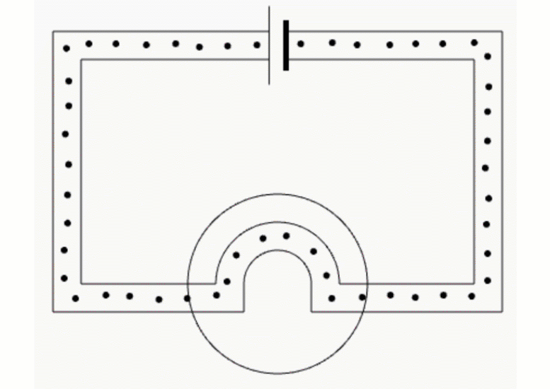 In our electric circuit animations we imagine lumping together these billions of free electrons into a single coulomb of charge represented by a black dot.