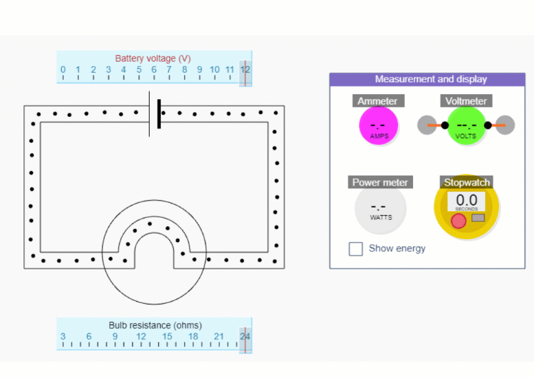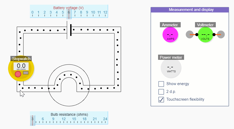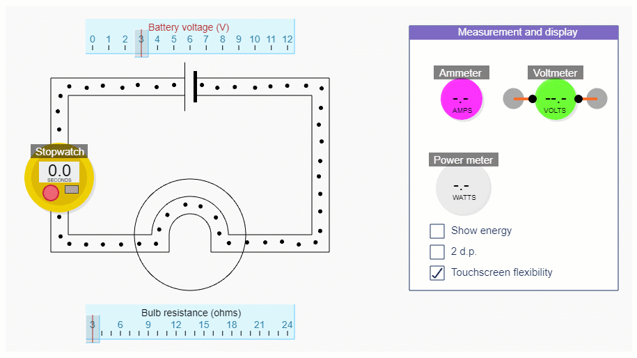 If you reduce the bulb resistance down to 3 ohms, you’ll be able to get the biggest range of currents. Change the current by changing the battery voltage - but remember we’re not trying to show this relationship explicitly.